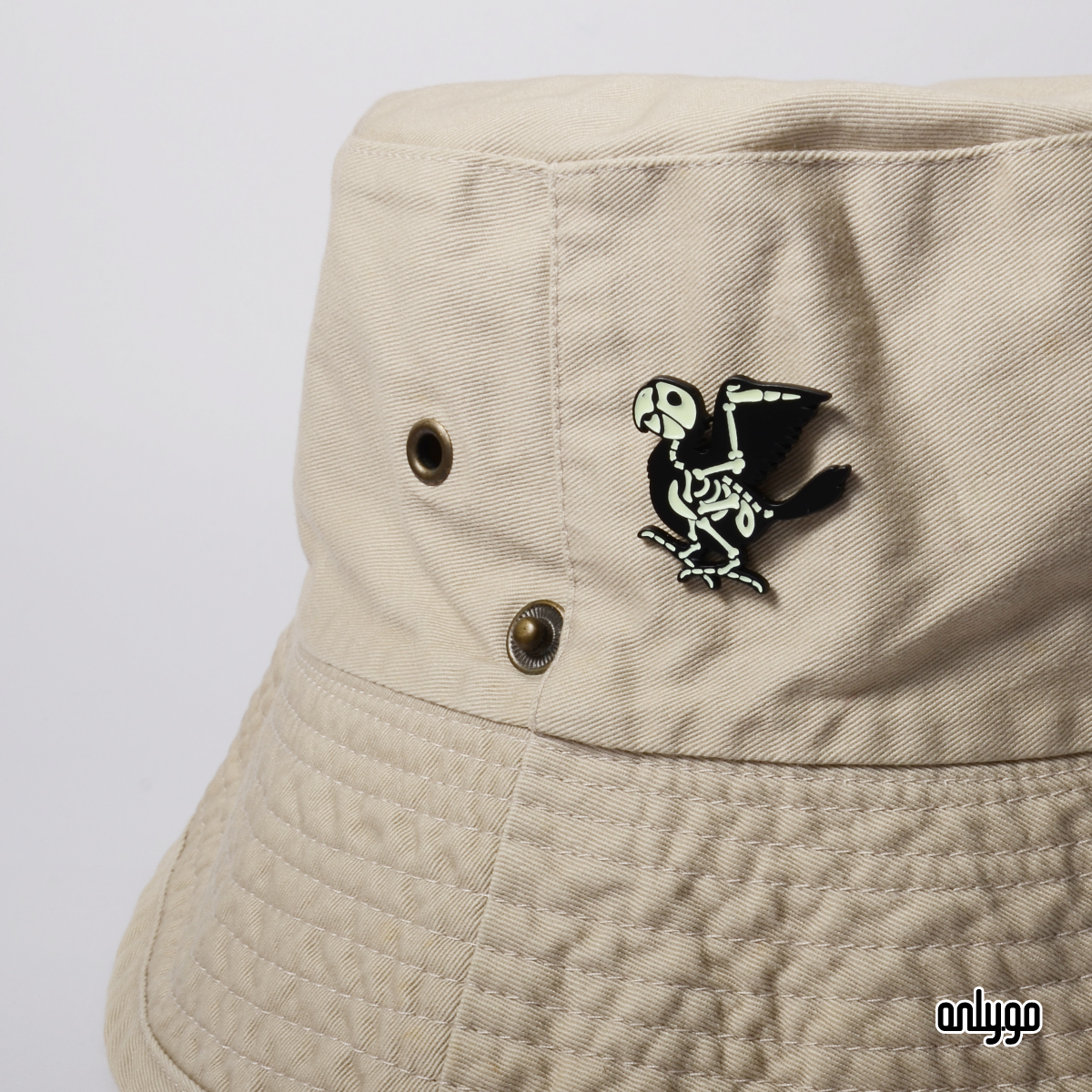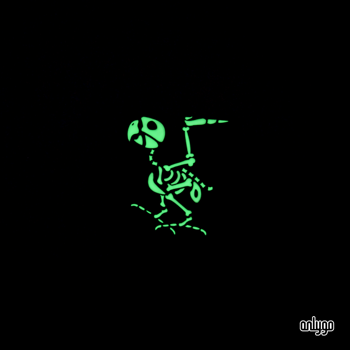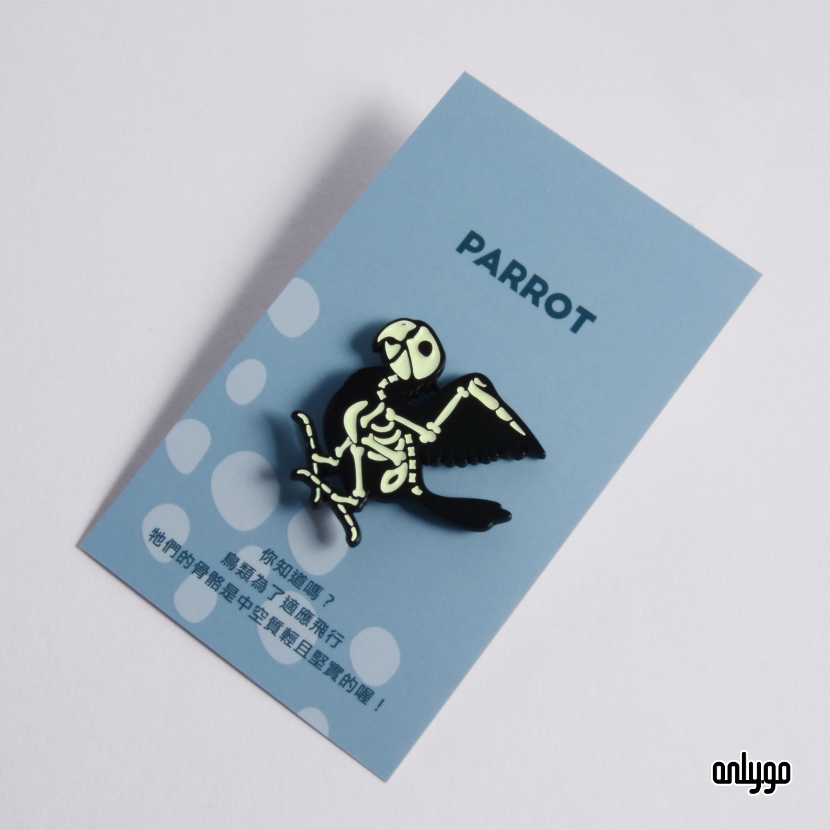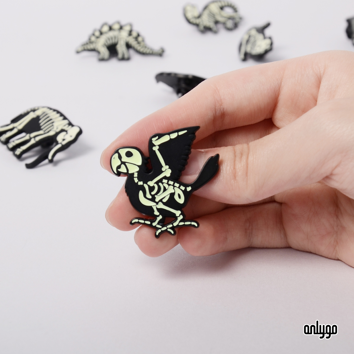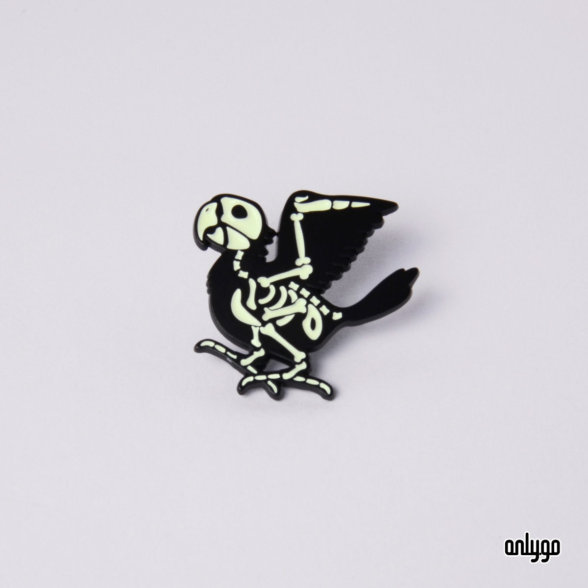 Onlygoのデザイナーは、夜になるとバッジが光るように、夜光顔料を下塗り剤として使用して骨を埋めました。